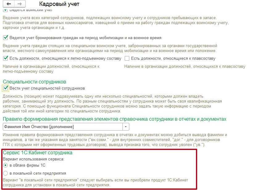 В открывшемся окне можно увидеть, что даже для включения такой функции, как расчет заработной платы, необходимо установить определенную отметку. Чаще всего она устанавливается автоматически. Если же ее снять, платформу 1С можно применять исключительно для ведения кадрового учета.