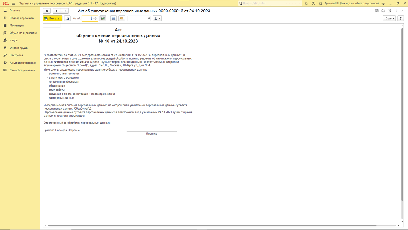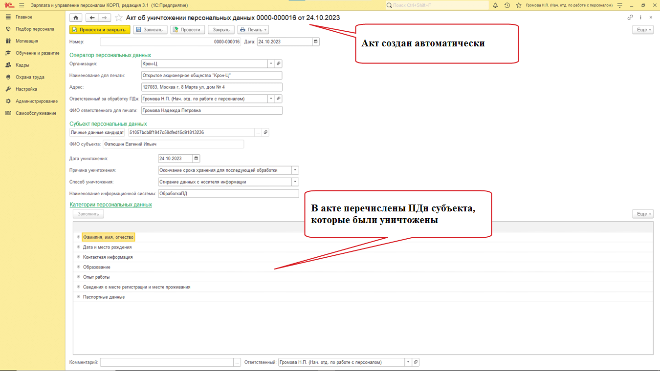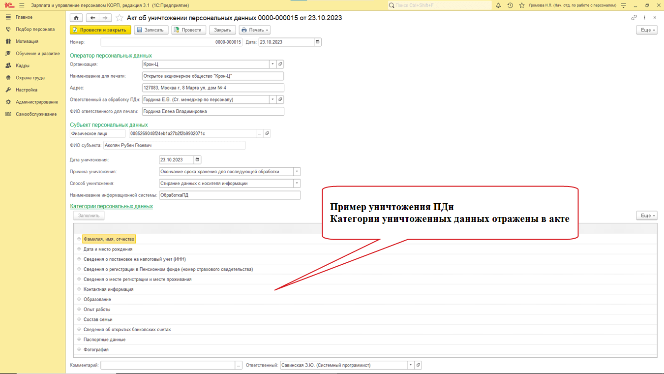 В законе упоминается обязанность оператора в ряде случаев уничтожить персональные данные по запросу субъекта. Таким образом, по заявлению физического лица работодатель обязан удалить: данные о его доходах, ИНН, страховой номер ПФР и другие сведения, хранить которые работодателя обязывает законодательство. Учитывая специфику зарплатных конфигураций, принято решение выполнять уничтожение только тех персональных данных, которые не подлежат обязательному хранению. Предполагается, что уничтожение данных может быть выполнено, например, по требованию кандидата, который предоставлял свои сведения на этапе подбора персонала, но в последствии так и не стал сотрудником.