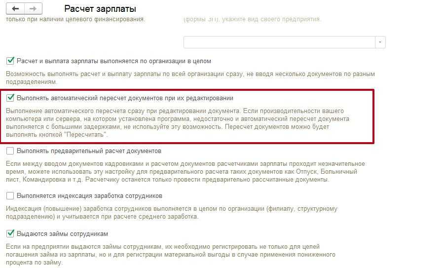 Выполнив все необходимые пункты из вышеперечисленных, можно приступить к расчету и начислению оплаты труда. Если возможности ПК позволяют, рекомендовано установить автоматический пересчет документации. Данная опция может быть установлена и снята пользователем: