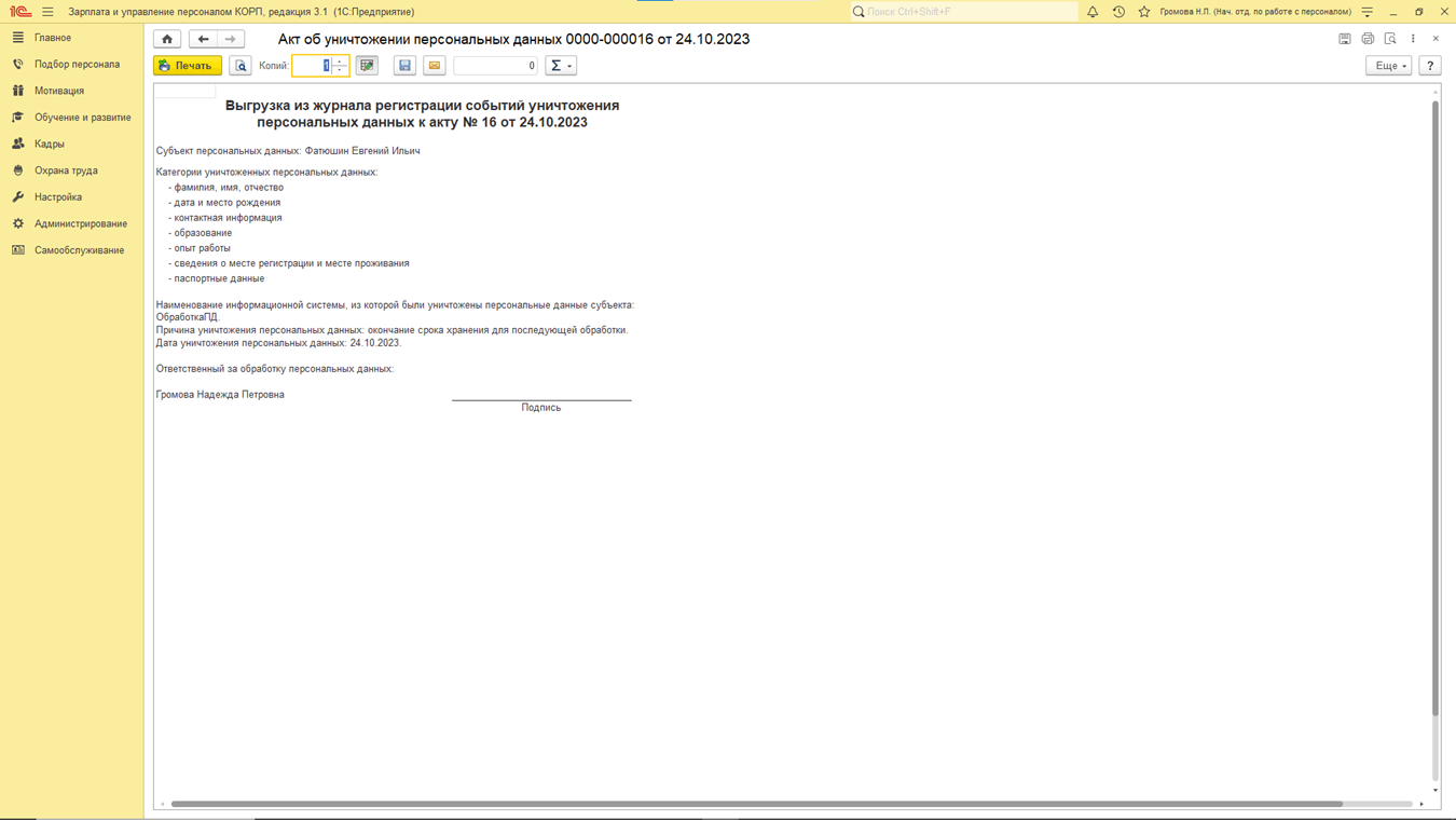 - Выгрузку из журнала регистрации событий уничтожения ПДн к акту