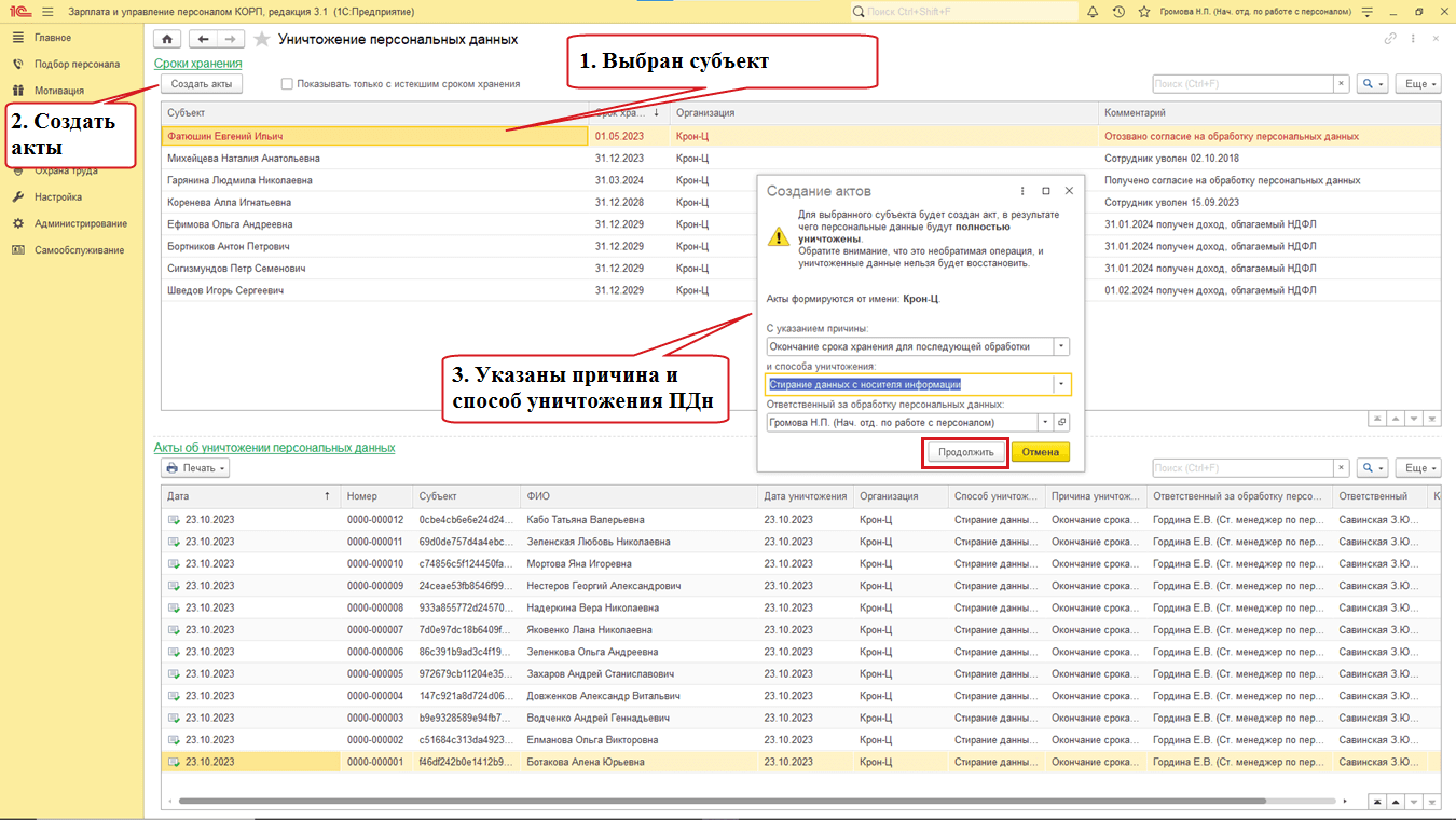 В верхней части помощника отображается список субъектов и срок хранения их ПДн. В нижней части — акты об уничтожении ПДн.