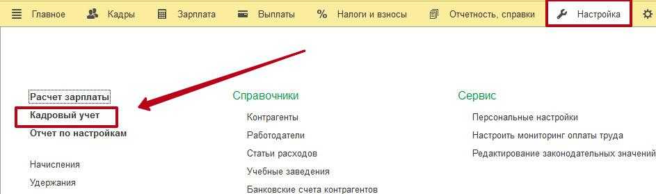 Начать можно с изучения настроек программы для установки нужных галочек и флажков в подсистеме расчета оплаты труда. Для этого нужно перейти в раздел Настройки главного меню: