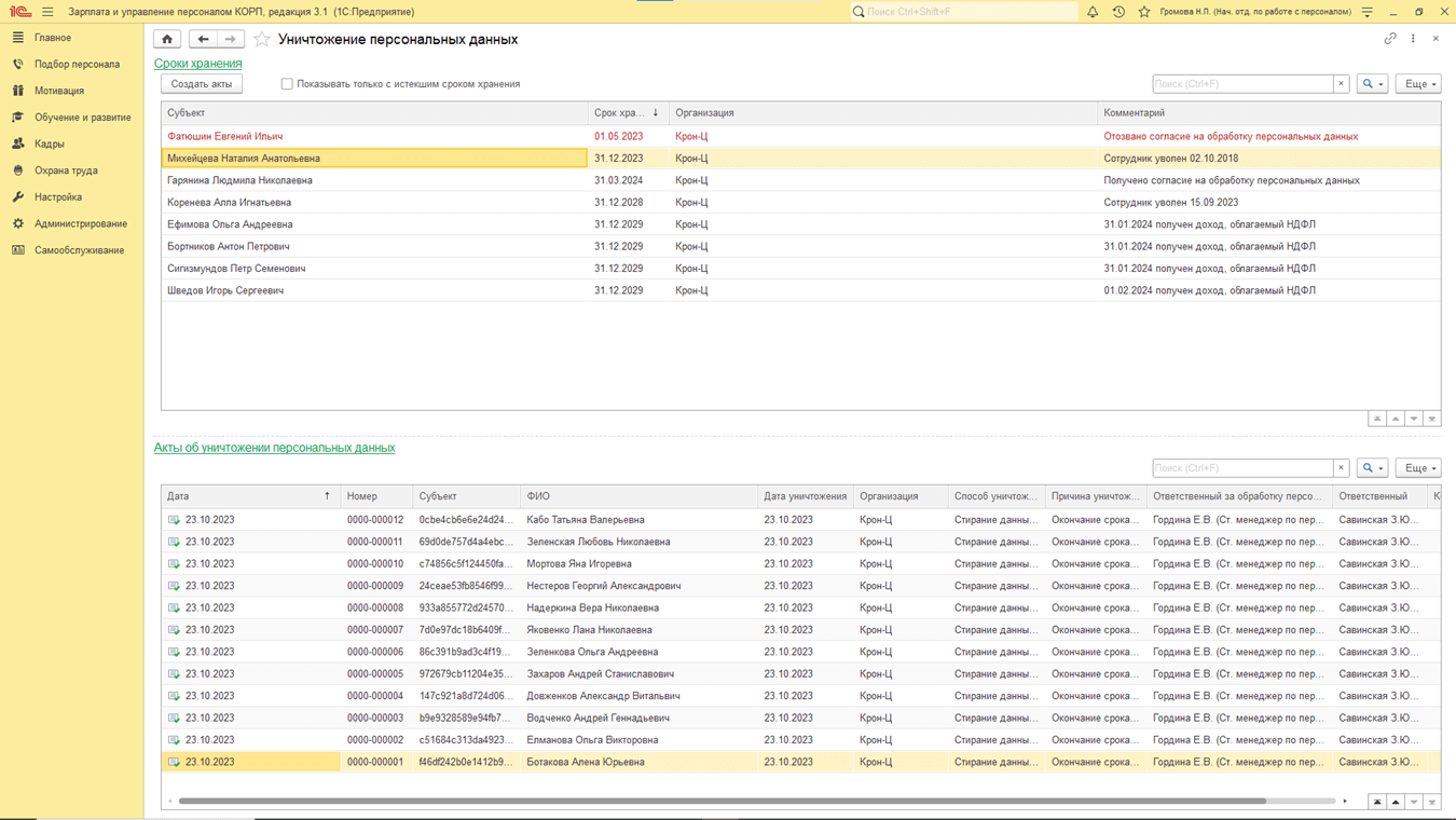 1С:ЗУП КОРП автоматически рассчитывает срок хранения персональных данных субъектов. Удалить персональные данные до того, как завершится срок их хранения, программа не позволит. Рассмотрим несколько примеров.