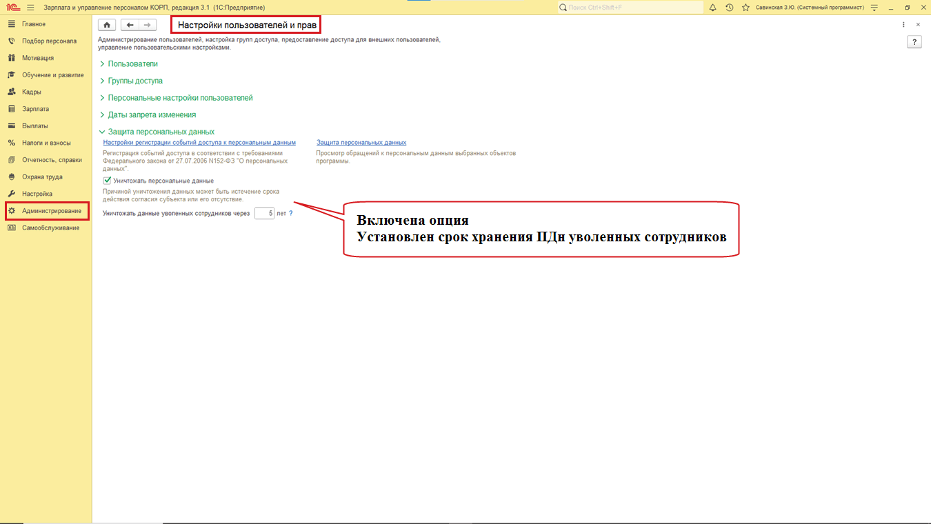 Чтобы начать использовать уничтожение персональных данных кандидатов и сотрудников, Администратор включает опцию в Администрирование/Настройки пользователей и прав. При включении опции автоматически устанавливается параметр — Уничтожать данные уволенных сотрудников через 5 лет. Количество лет хранения ПДн сотрудников может быть изменено в соответствии с действующим Законодательством.