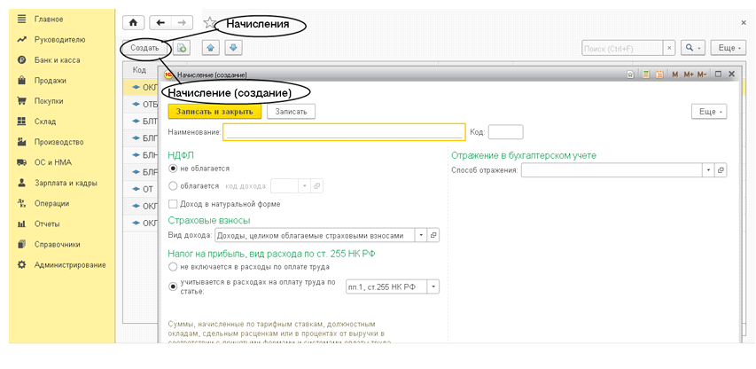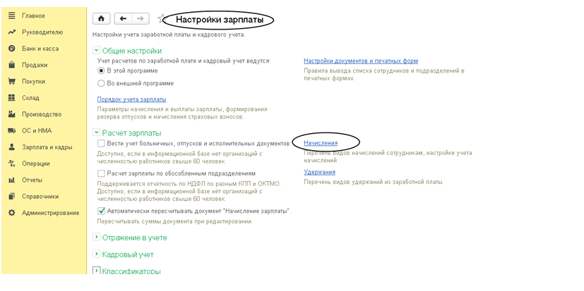 Для этого заходим в настройках, в блок «Начисление» для создания документа.