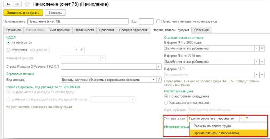- «Налог на прибыль», установить признак «Учитывается в составе расходах на оплату труда» и выбрать статью отнесения расходов;