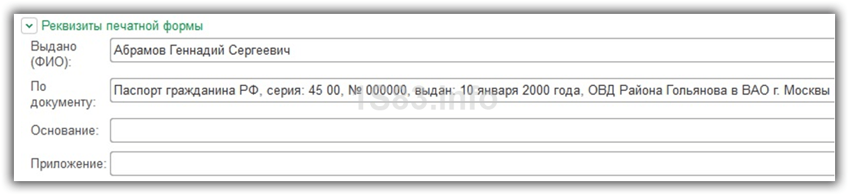 Если вам нужно отредактировать реквизиты печатной формы, разверните одноименный раздел. В нашем случае все отображаемые данные попали сюда автоматически при выборе сотрудника.