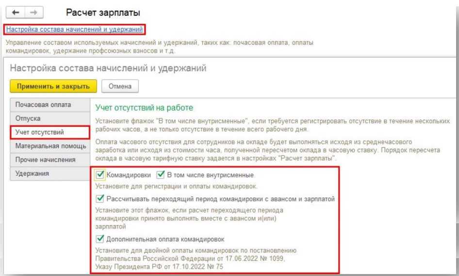 Важно! Чтобы позиция “Командировки” была активной, вам необходимо в изначальных настройках расчёта ЗП поставить соответственный флажок