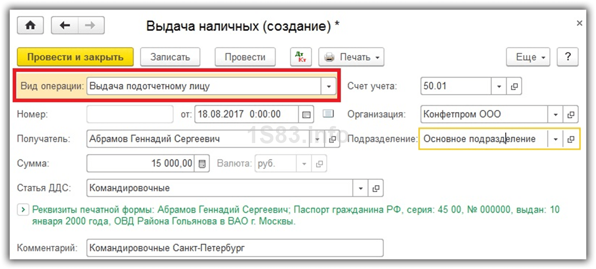 Теперь можно перейти к заполнению самого документа. Здесь нет ничего сложного. Первым делом выберите в поле «Вид операции» значение «Выдача подотчетному лицу»