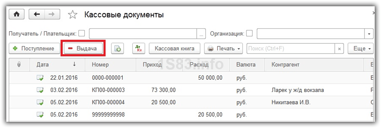 Перед вами откроется весть список ранее созданных документов по поступлению или выдаче денежных средств из кассы. Нажмите на кнопку «Выдача».