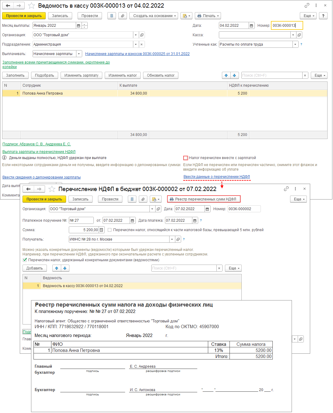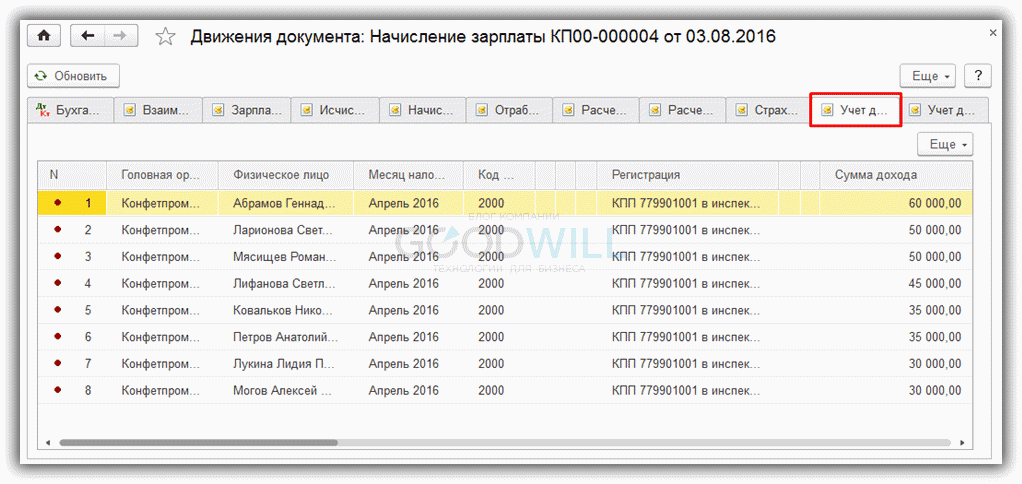 Также документ создает записи в регистре «Учет доходов для исчисления НДФЛ», по которому в дальнейшем заполняются формы отчетности: