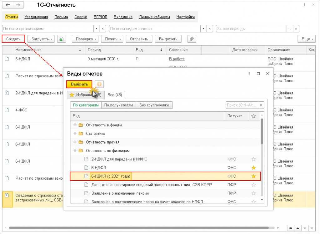 - выберите в форме Виды отчетов отчет с названием 6-НДФЛ (с 2021 года) и нажмите на кнопку Выбрать.
