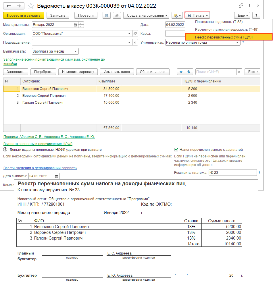 Если с датой документа все нормально и она раньше планируемой даты выплаты: То при заполнении ведомости тоже все будет хорошо, налог будет определен. При проведении Ведомости зафиксирован как удержанный налог.