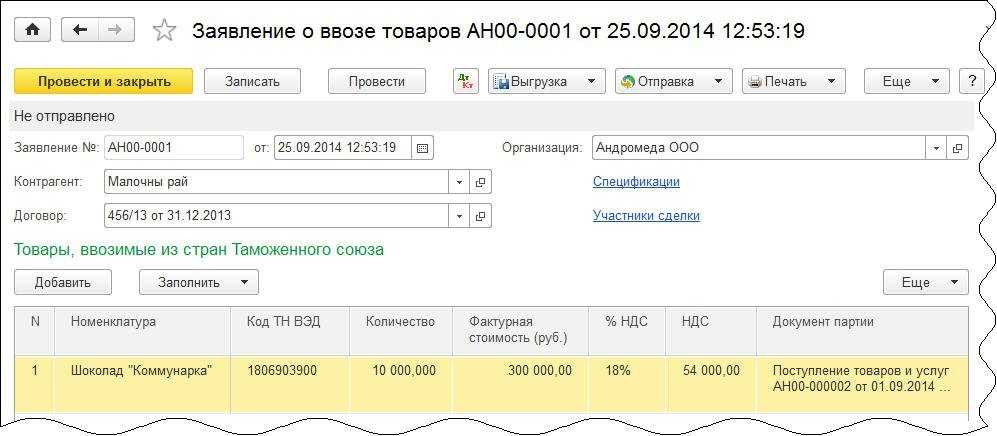 Для отражения в учете ввоза товаров из государств Таможенного союза предназначен документ Заявление о ввозе товаров