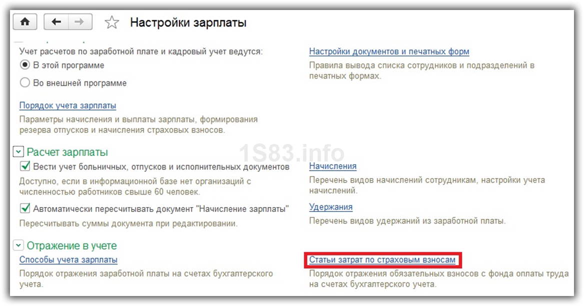 Для правильного отражения в бухучете страховых взносов нужно сделать еще одну настройку. В форме настройки зарплаты выберите пункт «Статьи затрат по страховым взносам». Именно здесь настраивается порядок отражения обязательных взносов с ФОТ на бухгалтерских счетах.