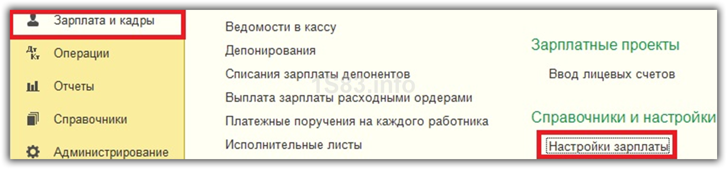 Первым делом приступим к настройке учета наших взносов. Они настраиваются там же, где и зарплата. В меню «Зарплата и кадры» выберите пункт «Настройки зарплаты».