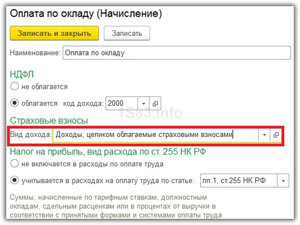 Откройте любое начисление. Вы увидите поле «Вид дохода». Именно от указанного в нем значения будет зависеть, начисляться по нему страховые взносы или нет. В нашем примере мы открыли одно из стандартных начислений, поэтому здесь уже все заполнено, но при добавлении новых не забывайте указывать вид дохода.