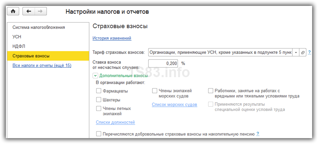 Так же здесь можно настроить дополнительные взносы для тех профессий, кому они положены, и указать, есть ли работники с вредными условиями труда. В самой нижней части можно поставить отметку о перечислении дополнительных страховых взносов на накопительную пенсию в соответствии с ФЗ №56 от 30.04.2008 года.
