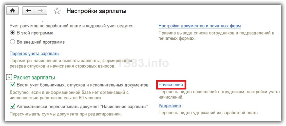 Вернемся на форму настройки зарплаты. В разделе «Расчет зарплаты» выберем пункт «Начисления».
