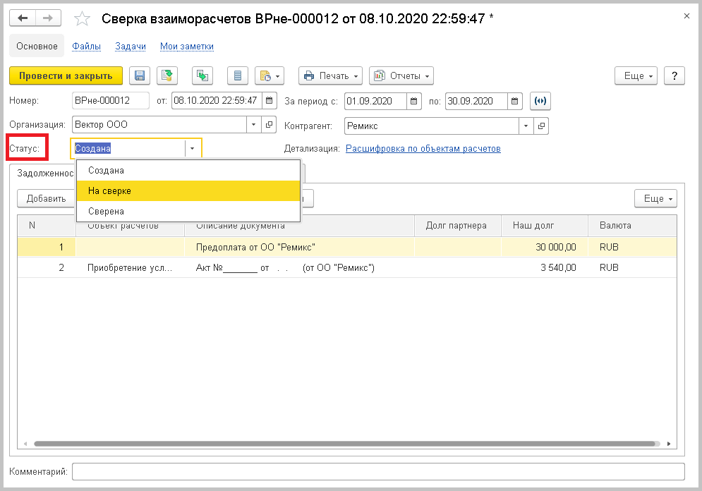 Чтобы провести акт сверки, нажмите на кнопку “Провести и закрыть”