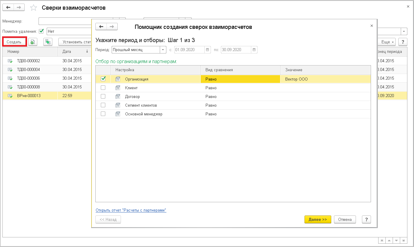 Настройка отборов для заполнения Акта сверки взаиморасчетов