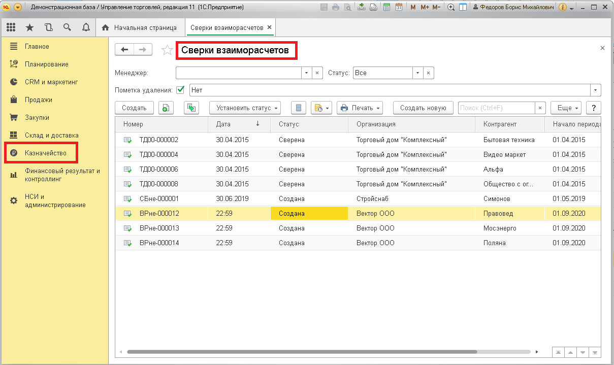В шапке документа в 1С 8.3 Управление торговлей 11 предусмотрены статусы, с помощью которых можно регулировать состояние сверки.