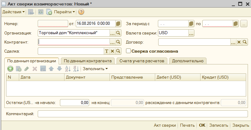 У меня по умолчанию заполнилась Организация и Валюта из настроек пользователя. Эти поля обязательны для заполнения. Причем организация обязательна даже в случае, когда вы планируете делать сверку по данным управленческого учета.