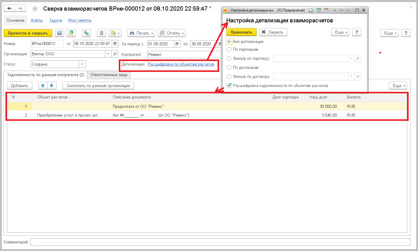 · взаиморасчеты за период (состав колонок и строк табличной части документа зависит от настройки детализации; при необходимости их можно изменить, перейдя по гиперссылке в поле «Детализация»);
