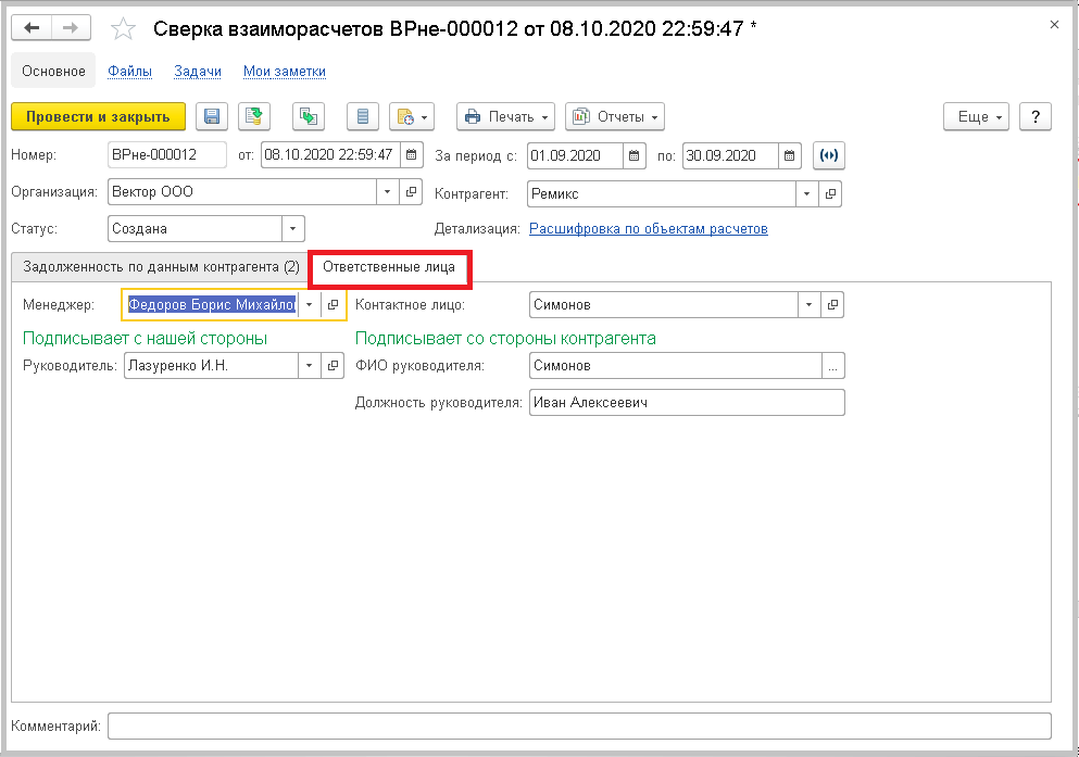 заполнить лицо, которое будет подписывать акт сверки от контрагента;