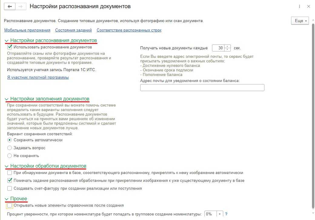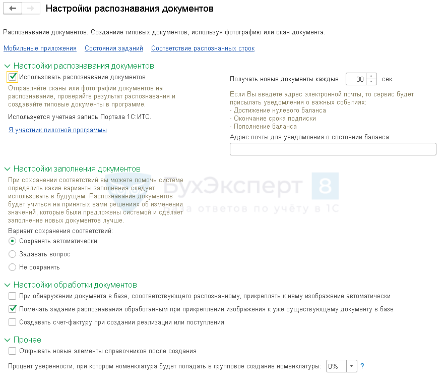 - флажок Использовать распознавание документов — отвечает за возможность распознавать сканы или фотографии документов и загружать их в 1С с использованием учетной записи Портала 1С:ИТС;