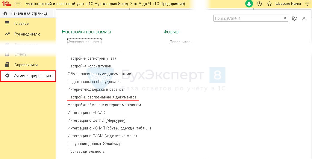 Настройки загрузки из скана (фото) в 1С задаются в разделе Администрирование — Настройки распознавания документов.