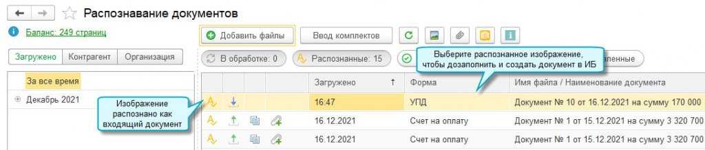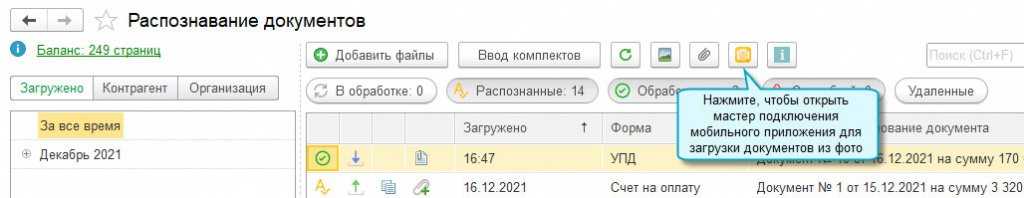 Например, в Бухгалтерии предприятия для этого в разделах главного меню «Продажи» или «Покупки» выберите пункт «Загрузить документы из сканов (фото)»