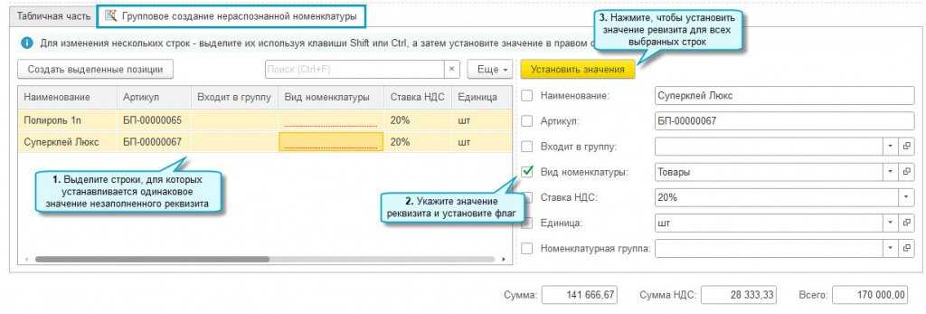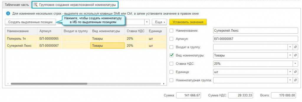 Шаг 10. Щелкните на поле «Номенклатура» и создайте новый элемент, нажав на всплывающую «подсказку».