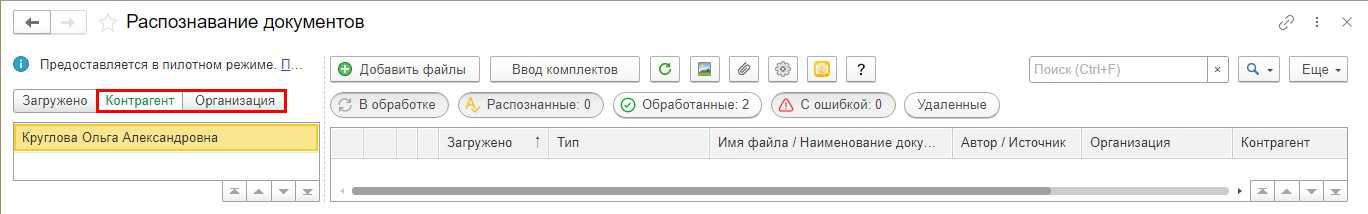 В рабочем месте «Распознавание документов» у нас два документа со статусом «Отработанные».