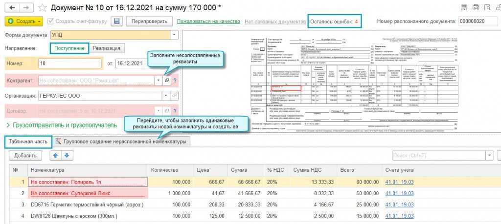 Шаг 5. Щелкните дважды мышкой на строке. Откроется форма ввода документа в 1С с заполненными по возможности реквизитами. А те данные, которые не сопоставлены, обозначены как ошибки.