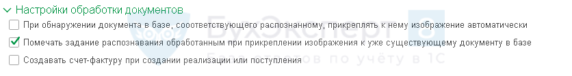 Группа Настройки обработки документов отвечает за автоматическое создание счета-фактуры по накладной и прикрепление изображения к документу: