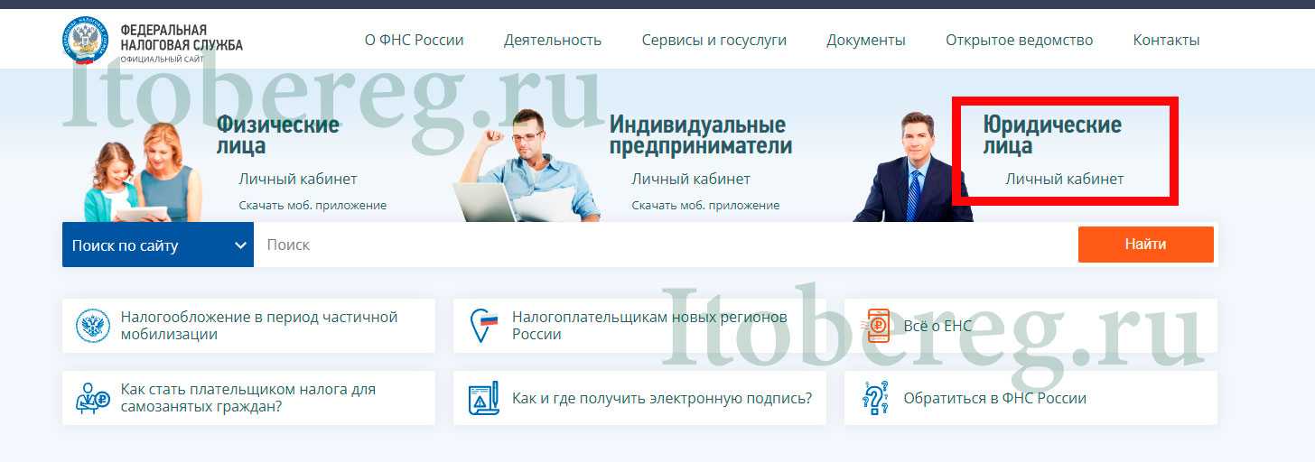 1. Заходим на сайт ФНС https://www.nalog.gov.ru и переходим в личный кабинет Юр. лица.