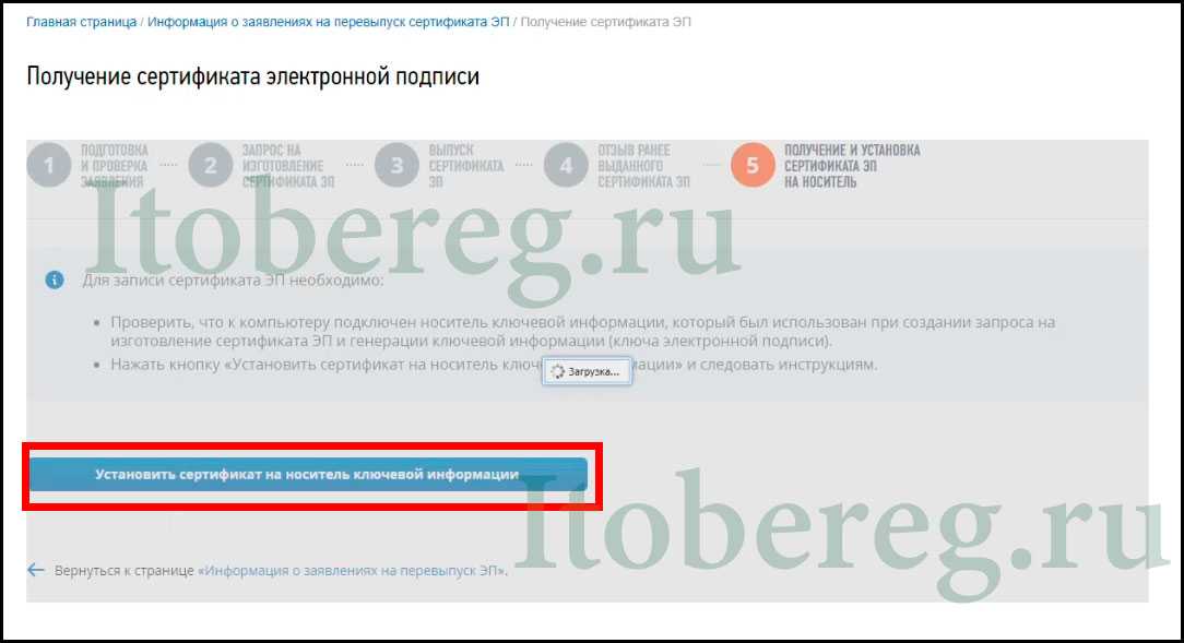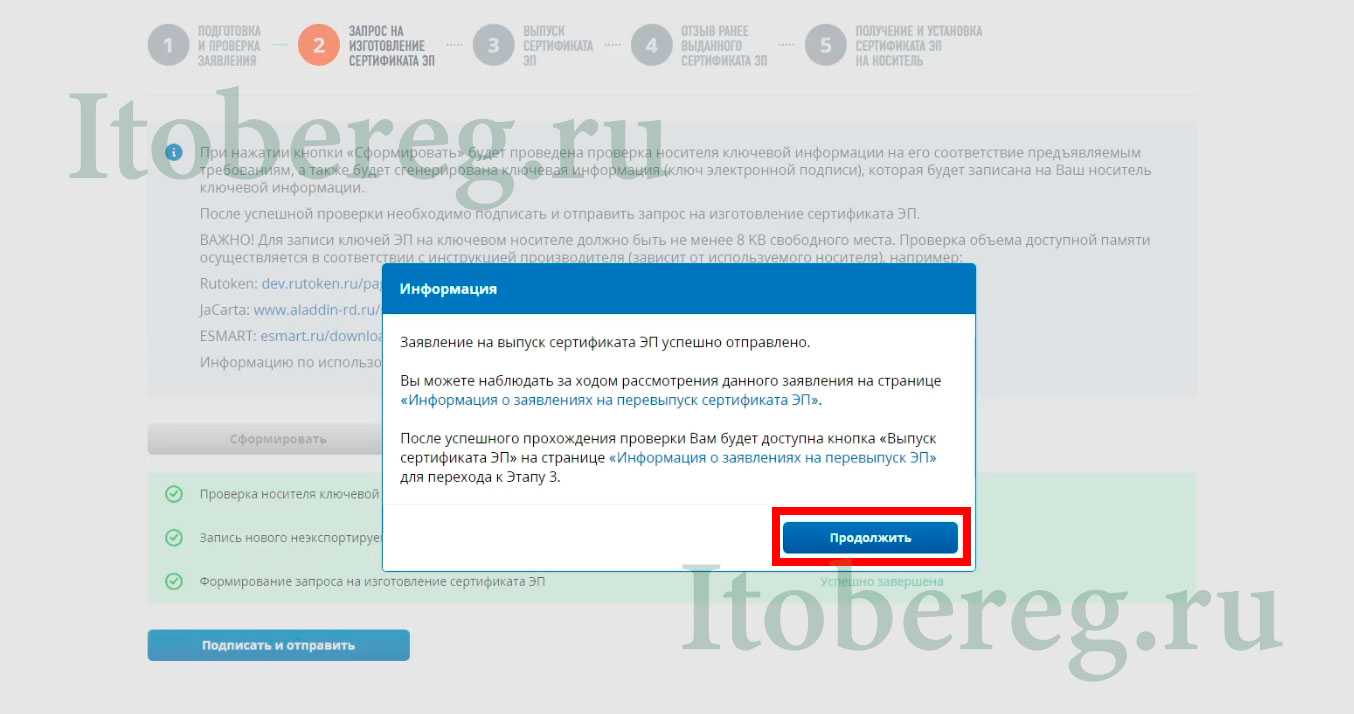 Вы снова попадете в раздел перевыпуска. Нажмите кнопку «Установить сертификат на носитель ключевой информации». Если появится уведомление, выберите «Продолжить», а затем нажмите «Ок».