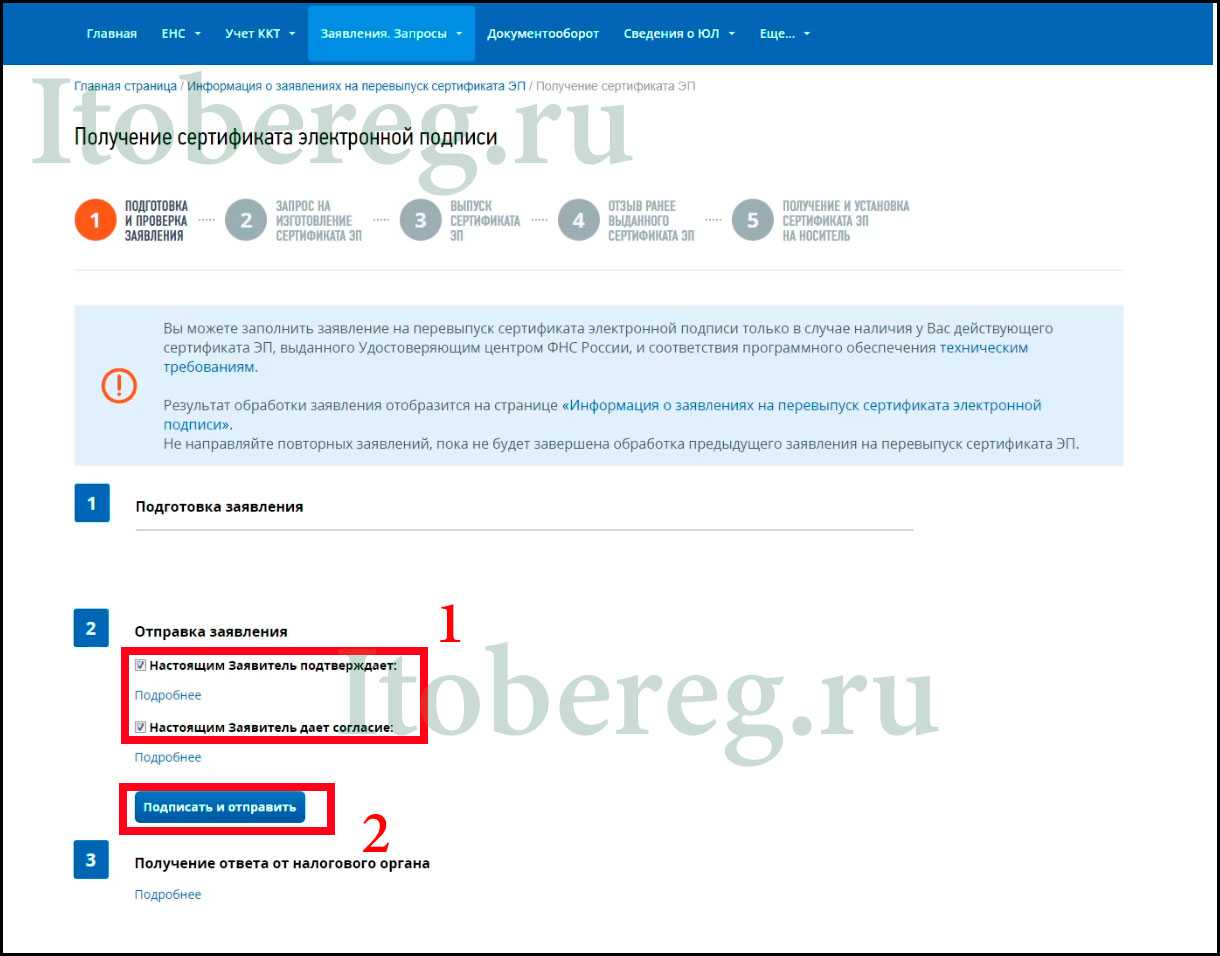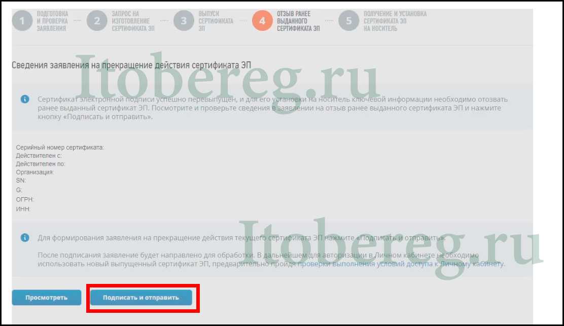 - Подпишите ЭЦП заявление на выпуск нового сертификата.
