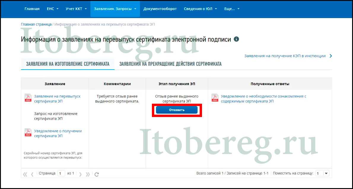 Вы окажетесь в разделе «Информация о заявлениях на перевыпуск сертификата электронной подписи». Нажмите «Отозвать».