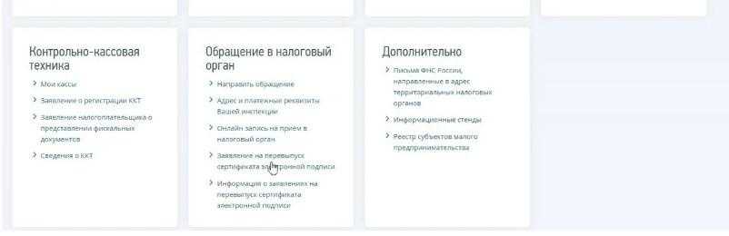 - В личном кабинете из списка всех сервисов нужно выбрать вкладку «Обращение в налоговый орган», и далее — заявление на перевыпуск сертификата электронной подписи.