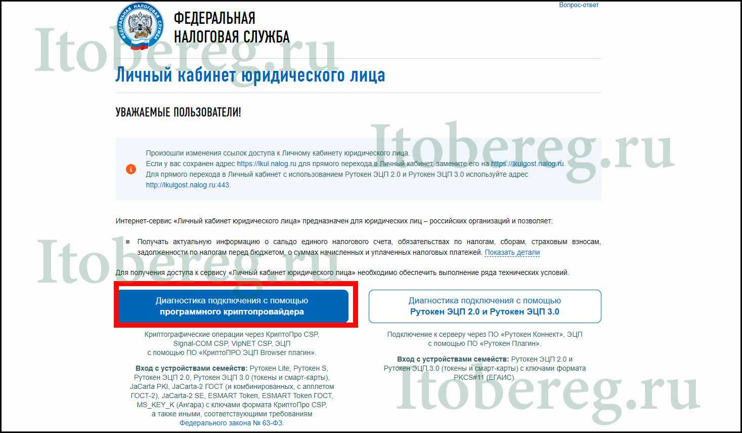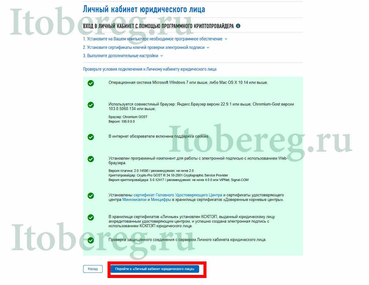Если какие то компоненты не установлены или что то не настроено, будет написано что именно не так. Исправляем и снова проходим проверку. После успешной проверки Нажимаем «Перейти в Личный кабинет юридического лица»