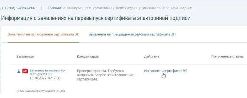 После этого нужно создать и отправить в ФНС заявление на перевыпуск сертификата. После отправки заявления происходит его обработка. В итоге после обработки заявления появляется надпись «Изготовить сертификат».