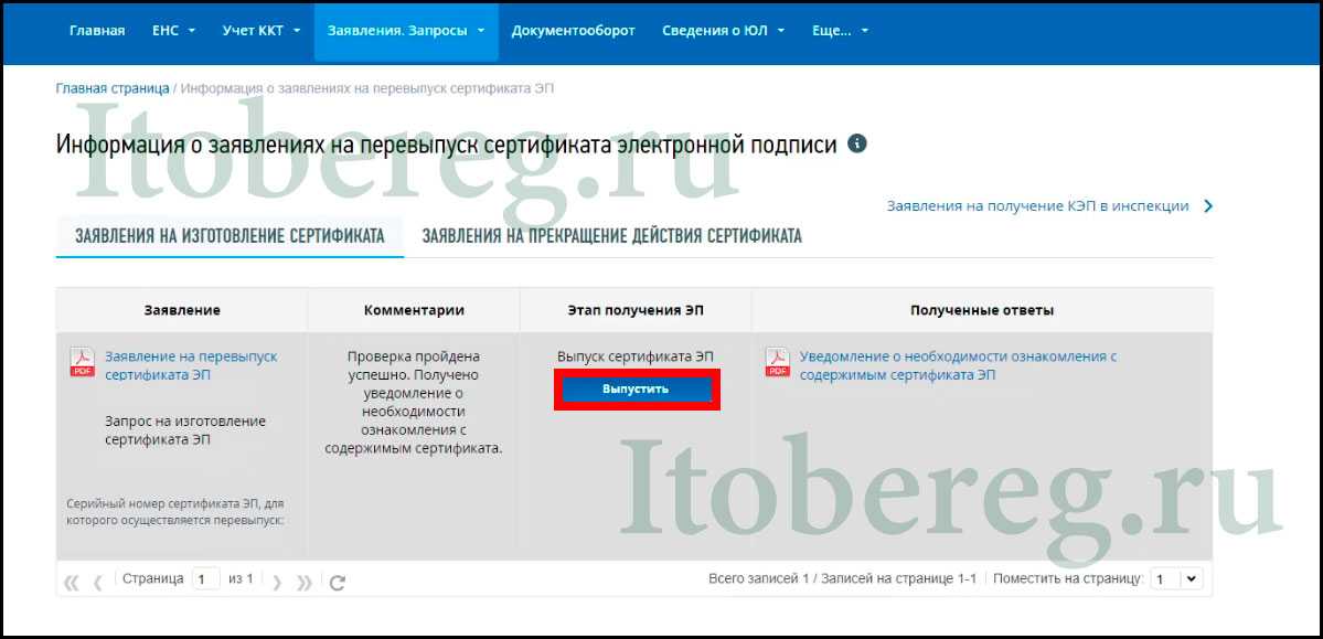 После обработки вновь зайдите в «Информация о заявлениях на перевыпуск сертификата электронной подписи» и нажмите кнопку «Выпустить».