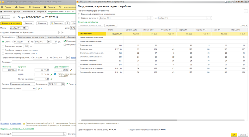 В текущих версиях ЗУП 3, к сожалению, существует неприятная особенность. Все данные по начислениям и времени , подгруженные в форму Ввода данных для расчета среднего заработка по кнопке Дополнить по данным ФОТ , следует перебить вручную, чтобы эти сведения сохранились и использовались при следующих расчетах. Рекомендуем после проведения документа, в котором вносилась информация для среднего заработка, сформировать по сотруднику новый документ по среднему заработку и проверить попавшие в него данные для среднего.
