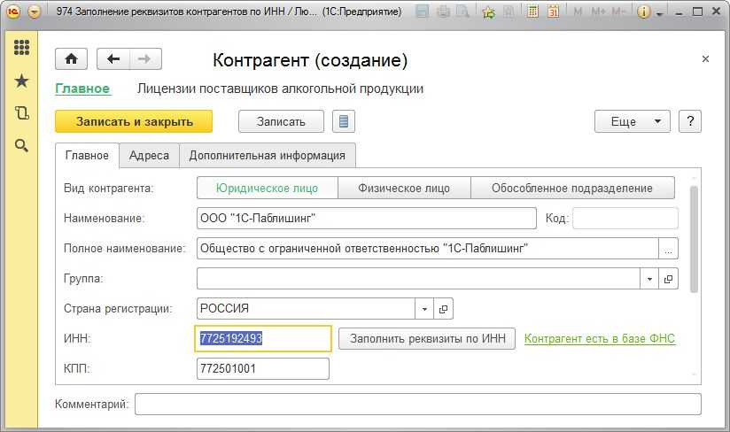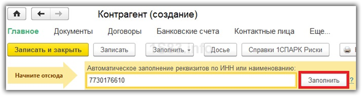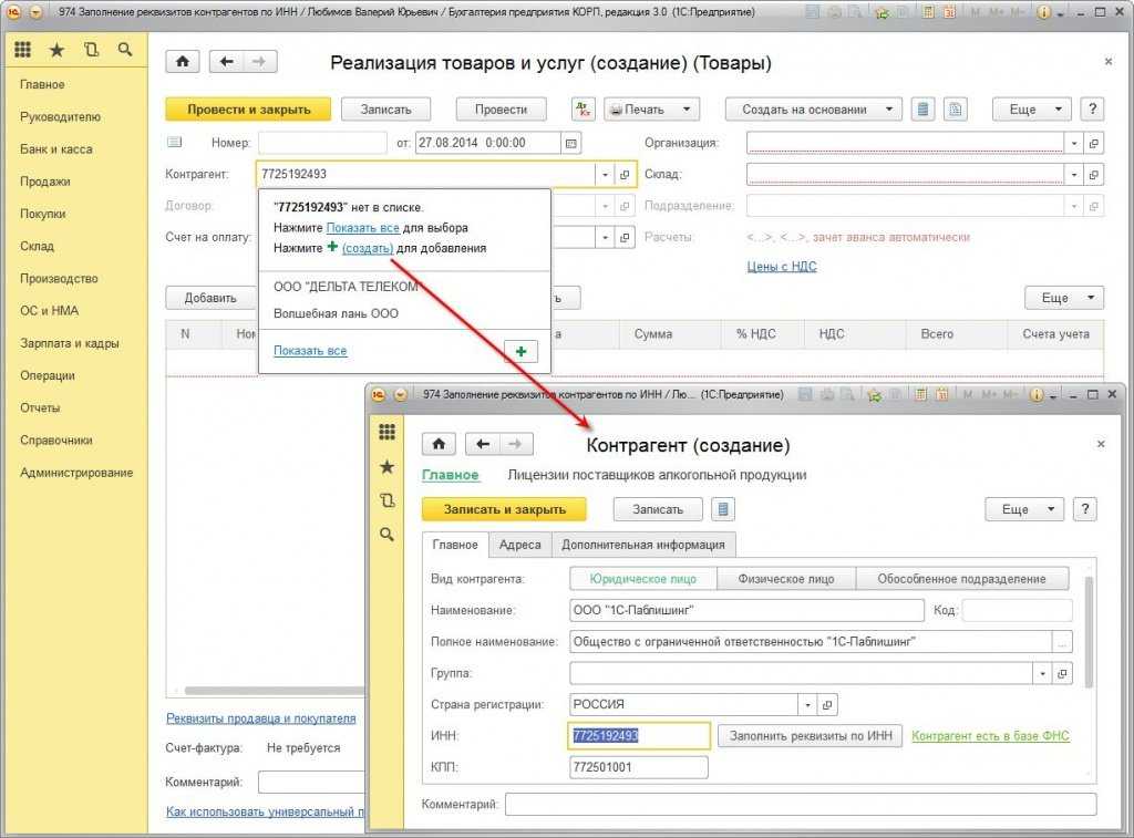 Рис. 1. Создание нового контрагента из справочника на основании ИНН