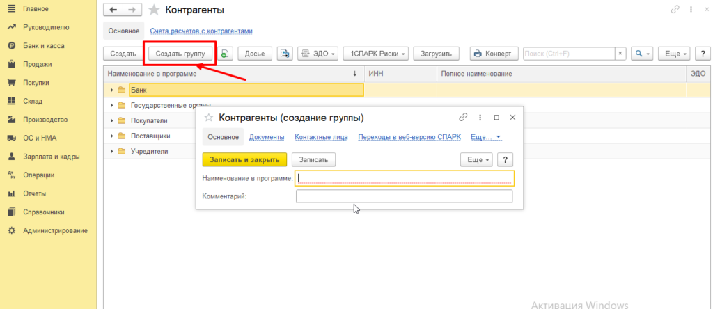 В поле «Наименование» вводим название группы и нажимаем кнопку «Записать и закрыть».