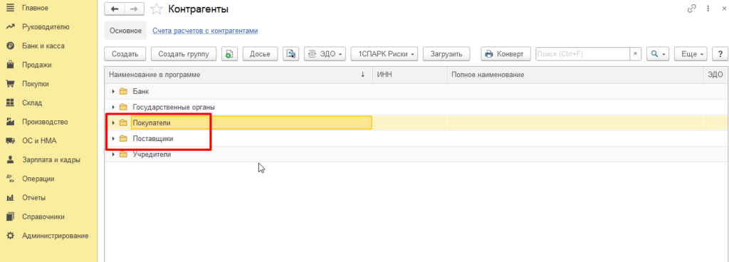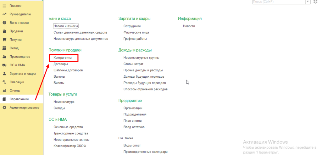 Для того чтобы заполнить справочник «Контрагенты» в меню слева выбираем: Справочники / Контрагенты.