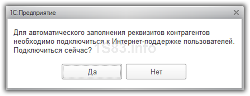 Для автоматического заполнения реквизитов контрагента необходим доступ в интернет и действующий договор ИТС.