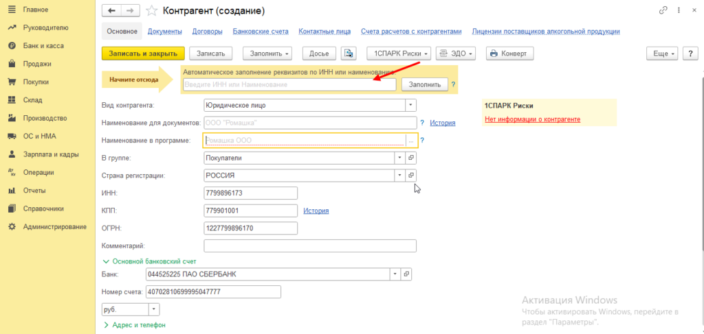 Если ИНН введен корректно и сведения о контрагенте есть в государственном реестре, то реквизиты заполняются автоматически (рис. 2).